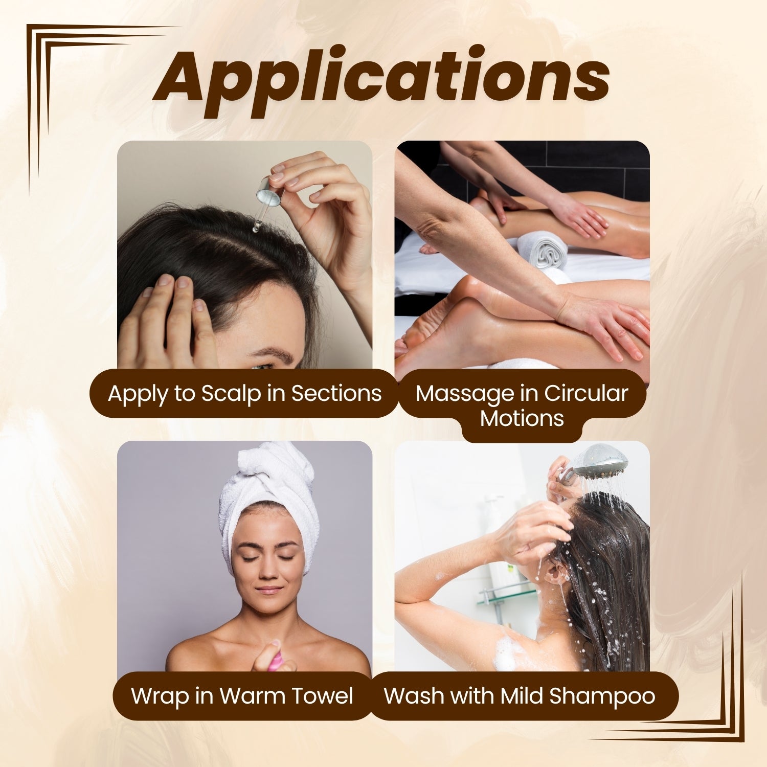 - Gently massage onto the scalp using circular motions, applying light to medium pressure.